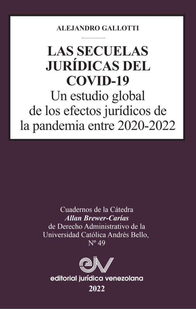 La obra de Alejandro Gallotti, publicada por la Editorial Jurídica Venezolana, tiene por objeto examinar, desde una óptica jurídica, la gestión administrativa-sanitaria de la pandemia conocida como Covid-19 por parte di diversos países europeos y americanos durante los años 2020, 2021 y 2022. Para ello fueron analizados diversos marcos jurídicos en materia sanitaria, así como la doctrina y jurisprudencia tradicional en materia de responsabilidad patrimonial del Estado, con un enfoque al caso concreto de la pandemia donde se acudirá a notas de prensa, revistas científicas, partes médicos de la Organización Mundial de la Salud (OMS), con el fin de aproximarnos a ciertas conclusiones respecto a la pertinencia y temporalidad de las acciones adoptadas por diversos países considerando las advertencias que provenían de la OMS, de los hechos notorios, así como de la opinión de especialistas.
