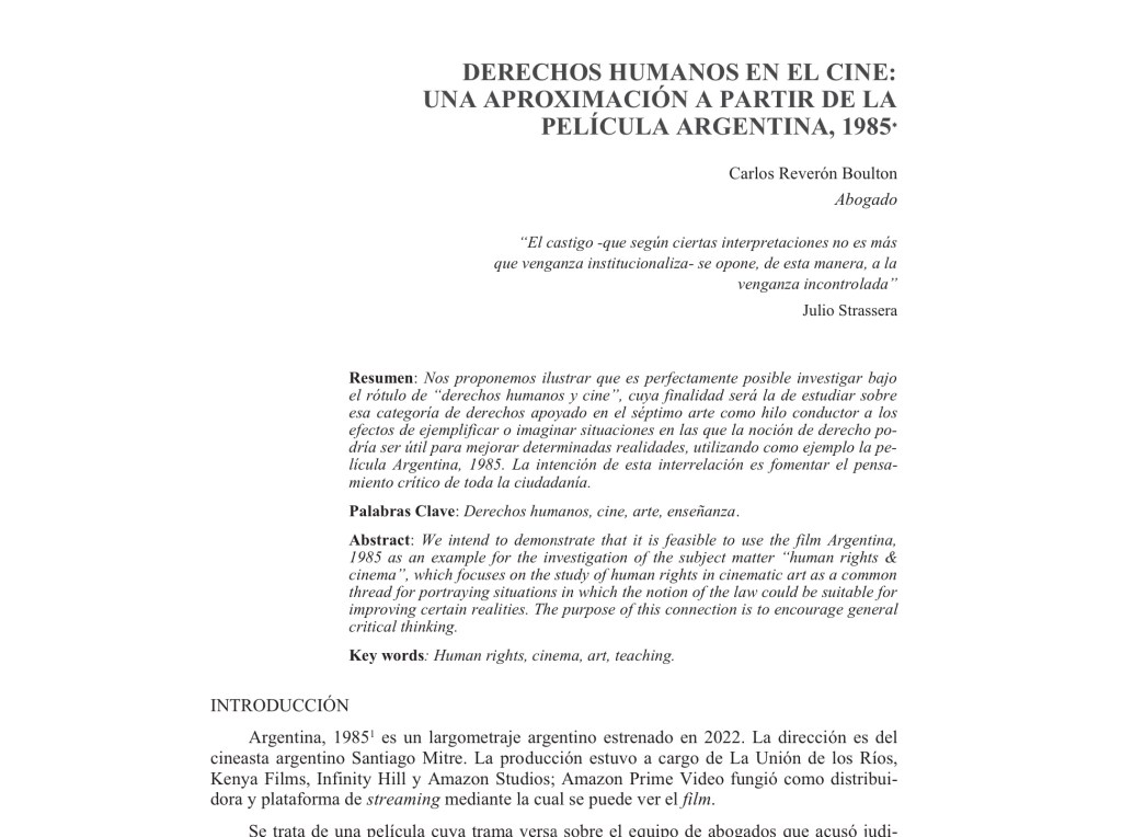 En segundo lugar, tuve la oportunidad de presentar un estudio sobre derechos humanos y cine para analizar la película Argentina, 1985. Ese trabajo surgió de una cordial invitación del Dr. Ramón Escovar para conversar sobre el largometraje en una de sus clases de doctorado en la Universidad Católica Andrés Bello, en noviembre de 2022.
