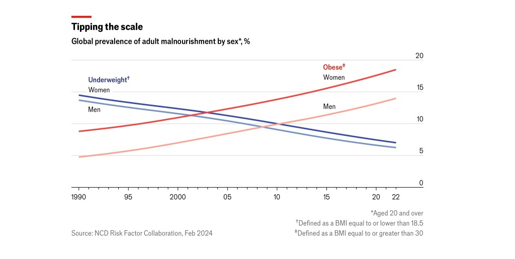 En un lapso relativamente corto, el panorama alimenticio mundial ha experimentado un cambio drástico, pasando de la escasez a la abundancia. Un estudio reciente publicado en the Lancet revela que más de mil millones de personas fueron catalogadas como obesas en 2022, un dato alarmante que refleja una tendencia preocupante. Ese informe, basado en mediciones de peso y altura de más de 220 mil individuos en aproximadamente 190 países, revela un incremento significativo en las tasas de obesidad tanto en adultos como en niños y adolescentes desde 1990. La obesidad, medida a través del índice de masa corporal (IMC), ha surgido como un problema global de salud pública, con consecuencias devastadoras que incluyen un mayor riesgo de enfermedades como la diabetes y varios tipos de cáncer.