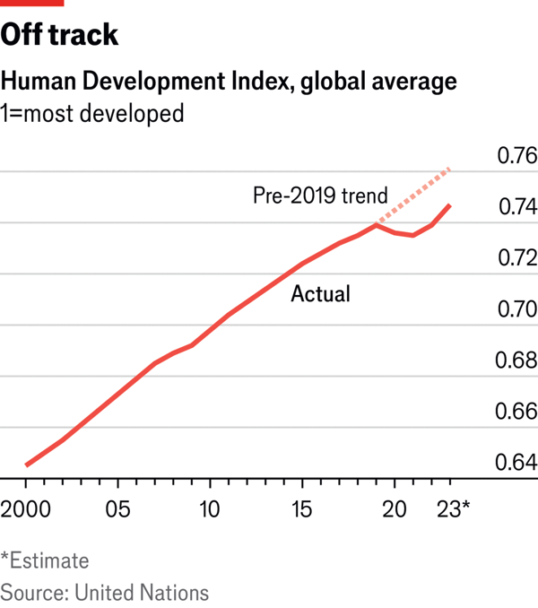 Según The Economist, la década de 2020 ha sido testigo de un caos sin precedentes, marcada por una pandemia seguida de una guerra en Europa y “eventos climáticos extremos” (sic) que evidencian el impacto del cambio climático. Estas crisis han provocado una disminución en los estándares de vida a nivel global, como se refleja en la caída del Índice de Desarrollo Humano (IDH) de la ONU en 2020 y 2021, siendo la primera vez en su historia que experimenta una baja. Aunque el IDH global muestra signos de recuperación en 2022, el progreso ha sido lento y desigual. Leer.