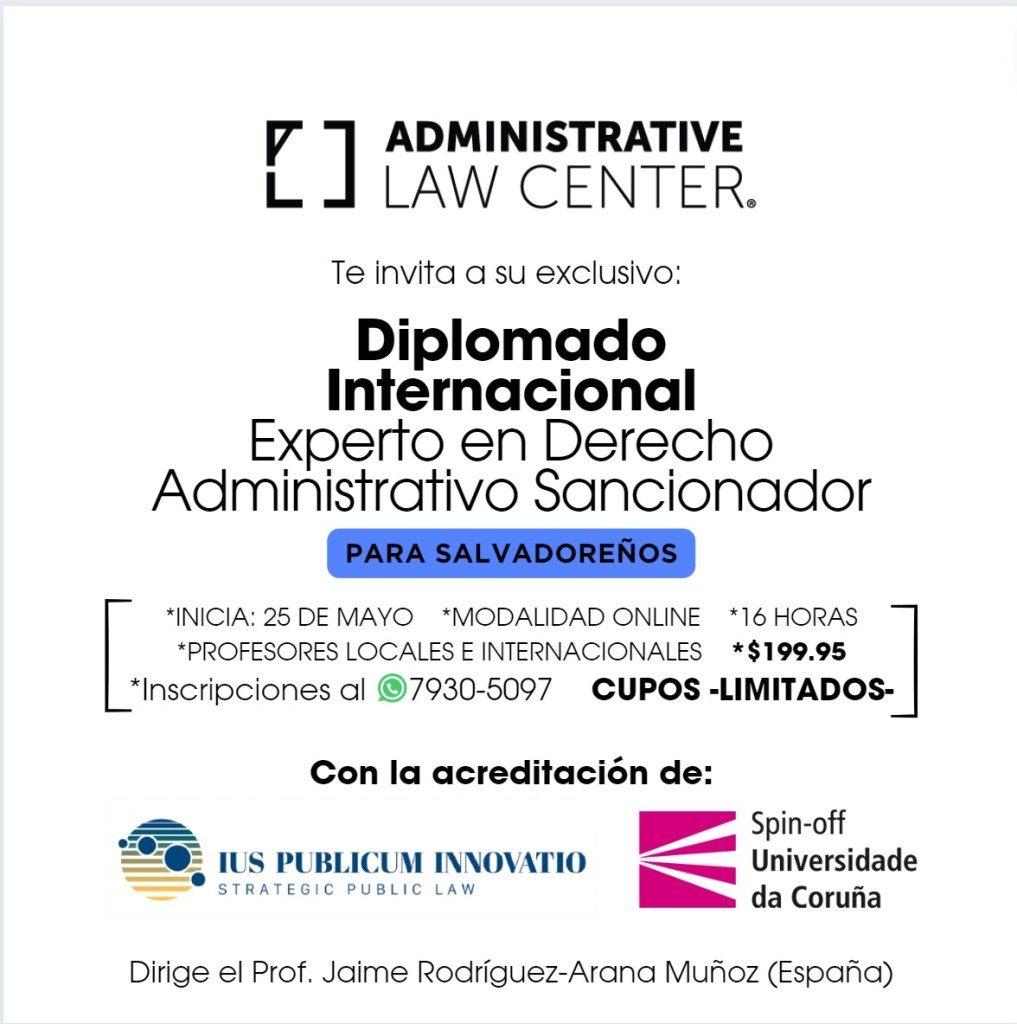 El 25 de mayo iniciará el Diplomado Internacional Experto en Derecho Sancionador, organizado por la sociedad civil, despacho de abogados, Administrative Law Center y Ius Publicum Innovatio, el cual se dictará para el público de El Salvador, debido a la aprobación novedosa de una ley general de Procedimientos Administrativos en ese país, cuestión que requiere de un profundo análisis sobre su diseño y aplicación a la fecha, de manera que el régimen previsto respecto a la potestad sancionadora esté en sintonía con los principios y garantías identificadas en la doctrina científica de Derecho Administrativo.