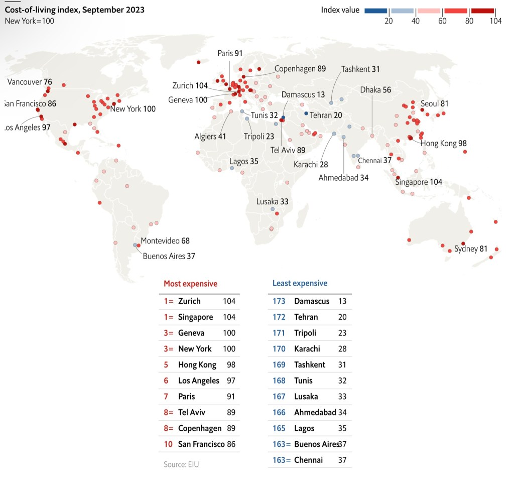- Resultados de la Encuesta Mundial de Costo de Vida 2024. Singapur y Zúrich lideran como las ciudades más caras con una puntuación de 104, mientras que Damasco es la más económica con solo 13 puntos.