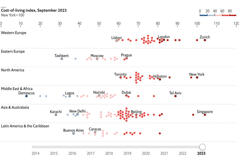 En el complejo panorama económico global, los costos de vida varían enormemente entre ciudades. Este año, según la encuesta mundial sobre el costo de vida de la Unidad de Inteligencia de The Economist (EIU), la ciudad menos cara del mundo es una capital bien conocida. En este análisis, exploramos cómo las ciudades se comparan con Nueva York, la ciudad de referencia del índice, y destacamos las diferencias regionales y el impacto de factores económicos como la inflación y la apreciación de monedas locales. Leer. Sobre ello destacamos los siguientes aspectos: