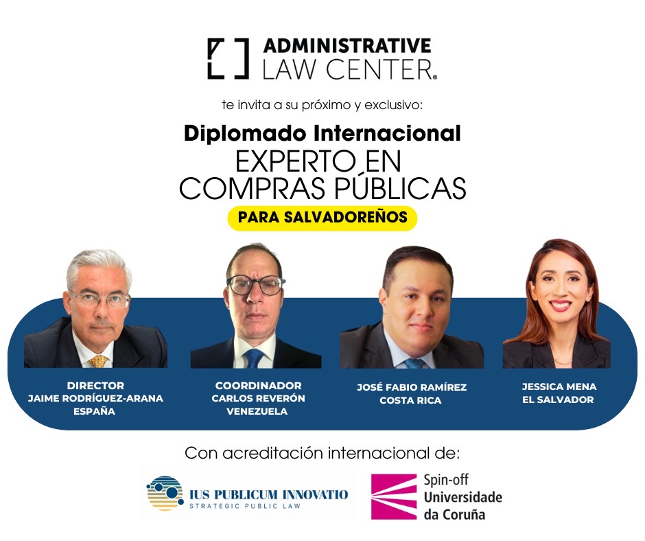 Atentos servidores públicos, empresarios, abogados, administrativistas y profesionales! Los sábados 8, 15, 22 y 29de noviembre de este año, se llevará a cabo el Diplomado internacional Experto en Compras Públicas para salvadoreños. Un programa integral y de vanguardia impartido por expertos en la materia, totalmente online, bajo la dirección del Catedrático español Jaime Rordríguez-Arana muñoz, presidente del FIDA, y bajo la aprobación y acreditación de la Spinn-off de la Universidade da Coruña.